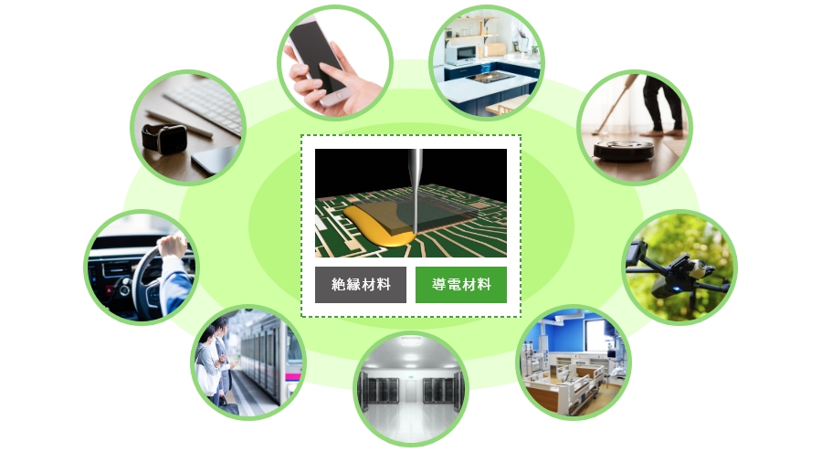 電子部品や回路に欠かせない「導電材料」「絶縁材料」を中心に、研究・開発、製造、販売を行っています。