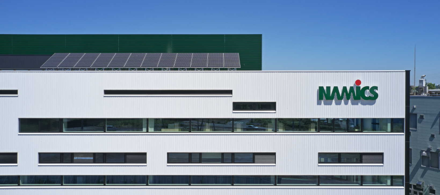 ナミックスは、新潟市北区・濁川の本社・工場エリアと研究開発拠点ナミックステクノコアを拠点に、研究開発に強みを持つ材料メーカーとして、生活に欠かせない電子機器の中核を支える材料を手がけています。