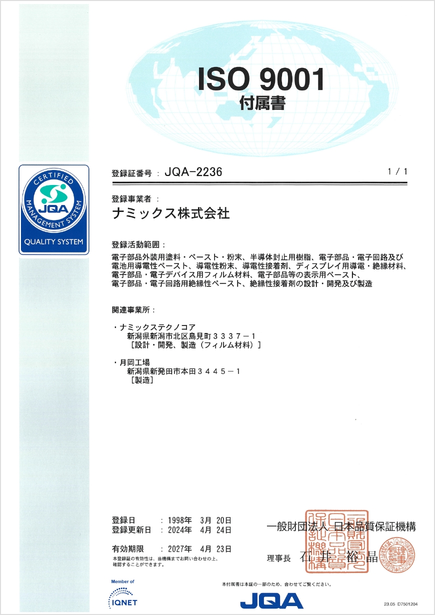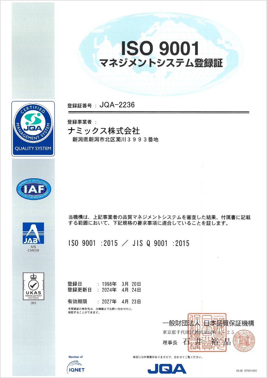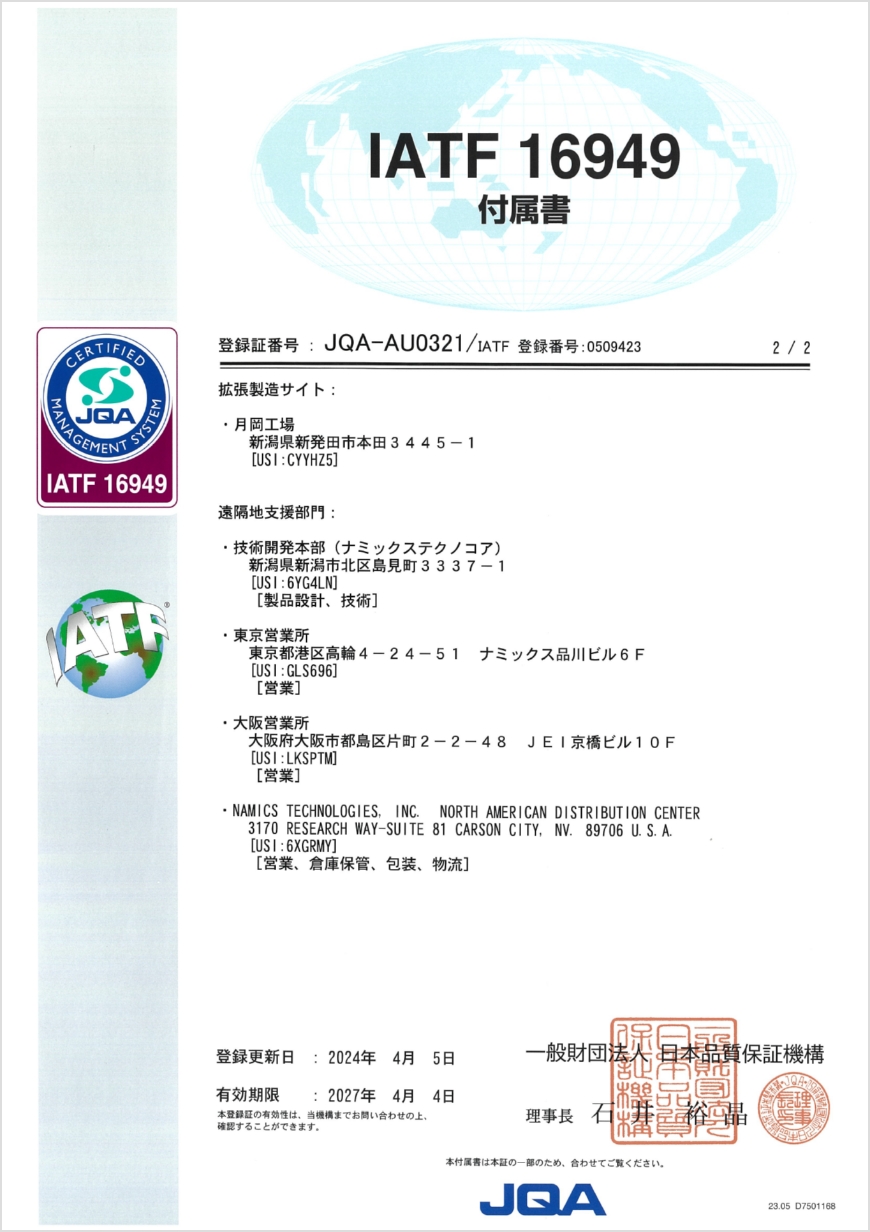 また、2009年4月にISO/TS16949を認証取得し、2018年4月に自動車搭載部品向け用途に対し、IATF16949に登録を更新しました。