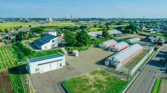 ナミックスの農業事業と、スマート農業実証の拠点となっているのが、新潟市北区にあるラボです。小学校跡地を活用した約2,000坪の敷地に、温室ハウス3棟と完全閉鎖型栽培室3室を備えた実証施設が広がります。