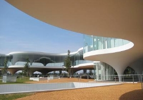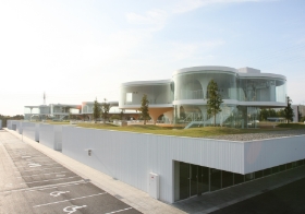 本社敷地内には、事務部門や共用スペースが集約された「管理厚生棟」があります。自然光が差し込む吹き抜け空間や、外装と一体になったシンボリックなデザインが特徴で、「人と自然・地域・社員の共存共栄」をコンセプトに設計されたオフィスです。